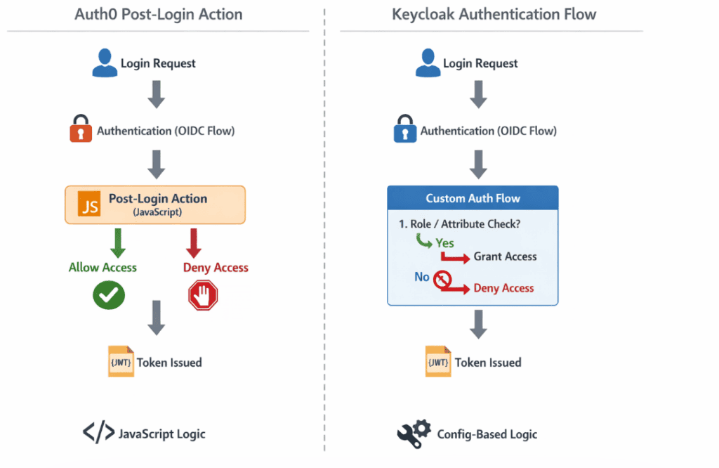 Below diagram illustrates how post-login customization differs between Auth0 and Keycloak: