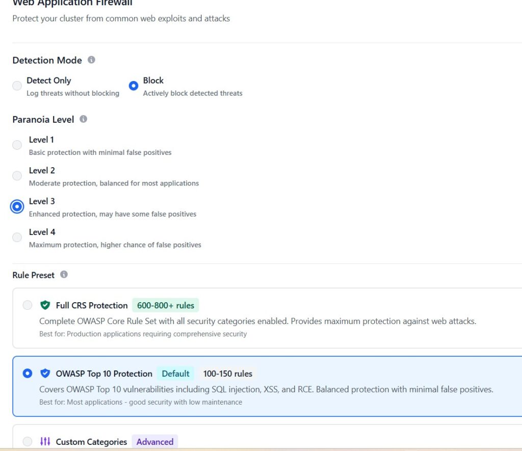 Start with the basics, rate limiting and admin access controls, then gradually add OWASP rules and custom policies as you understand your traffic patterns. Use log-only mode to tune before enforcing, and review your WAF events regularly to stay ahead of evolving threats.