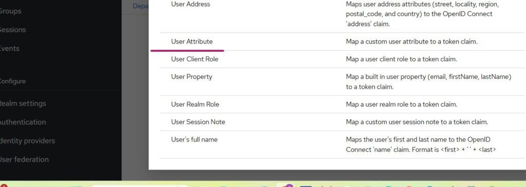 Navigate to Client -> Client Scopes and select the client dedicated link as highlighted above and further choose Add Mappers -> By Configuration from the mappers tab and further select User Attribute as shown below: